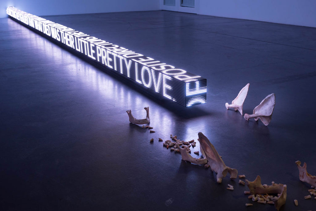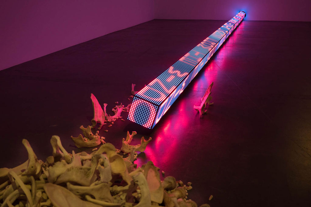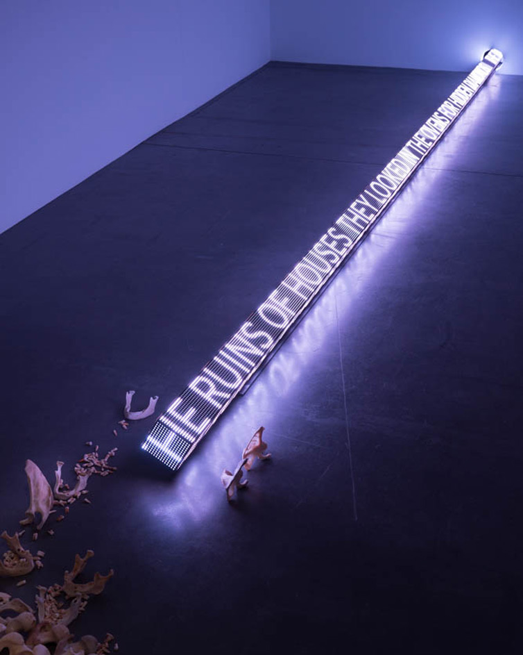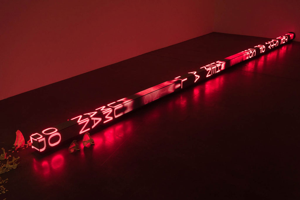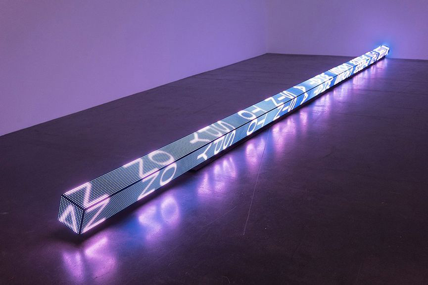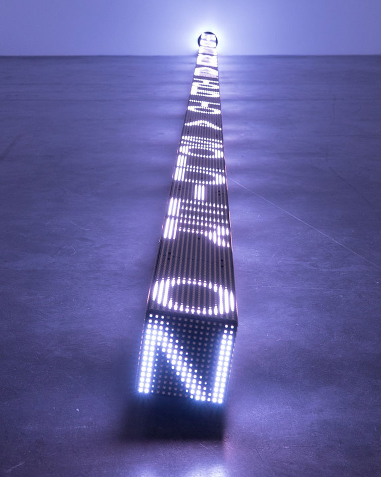 “RAM” is a three-sided LED stretching over seven metres long. Words scroll along each face of the horizontal LED at varying speeds, before flashing, blacking out and then breaking into a rainbow spectrum of colour that casts a mesmerising glow on the surrounding floor. The differing speeds evoke speech patterns that Holzer describes as ‘the kinetic equivalent to inflection in the voice’. The text of ‘RAM’ is taken from an epic poem cycle by Anna Świrszczyńska (Swir), who joined the Polish resistance during World War II and worked as a nurse during the Warsaw uprising of 1944. Her 1974 work, ‘Building the Barricade’ (Budowałam Barykade), in a new English translation by poet Piotr Florczyk, addresses the atrocities of war from first-hand perspective, describing the suffering and heroism Swir observed during the 1944 Nazi siege and destruction of Poland’s capital. With the aid of robotics, ‘RAM’ moves back and forth and rotates from side to side, suggesting the motion of military battering rams. Its physical aggressiveness emphasises the brutality of Swir’s subject, challenging the conventional myths of war traditional to sculpture and poetry.