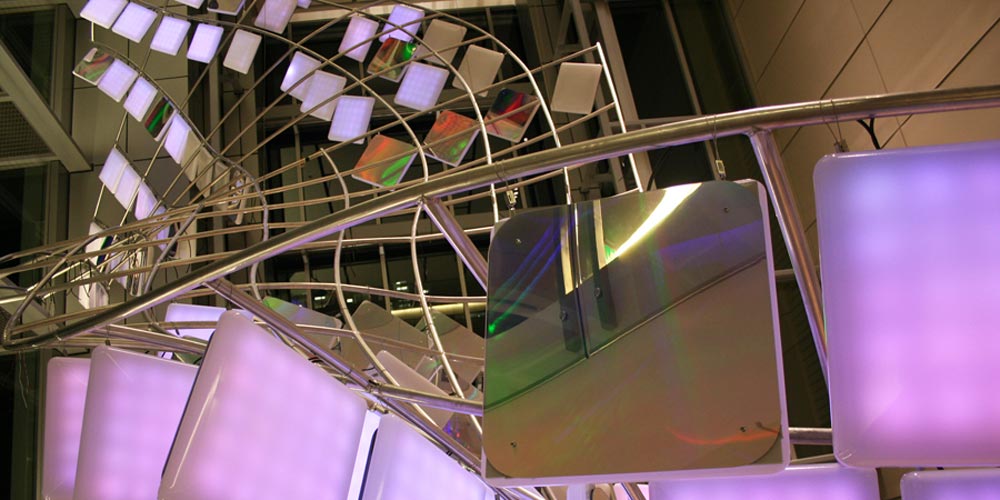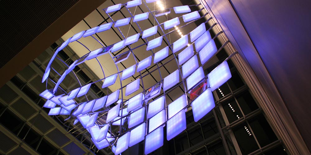 holographic mirrors, which forms a sculpture suspended above the lobby