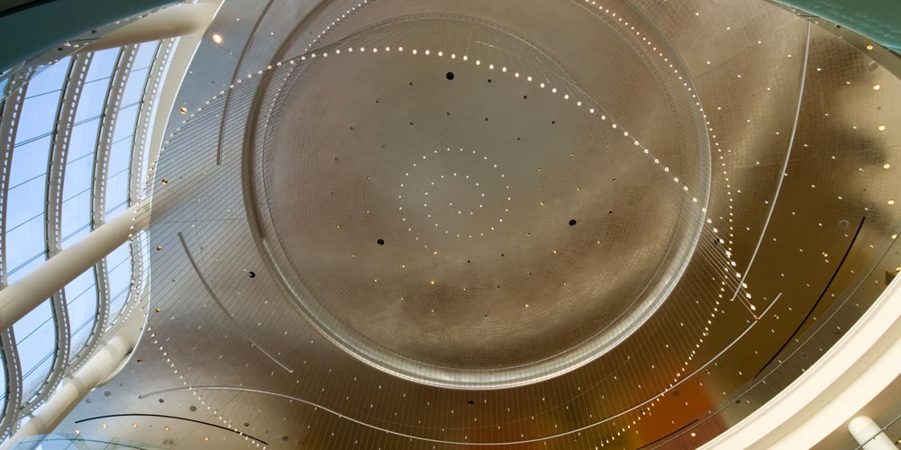 pendants spiraled down from the ceiling of the concert hall lobby,